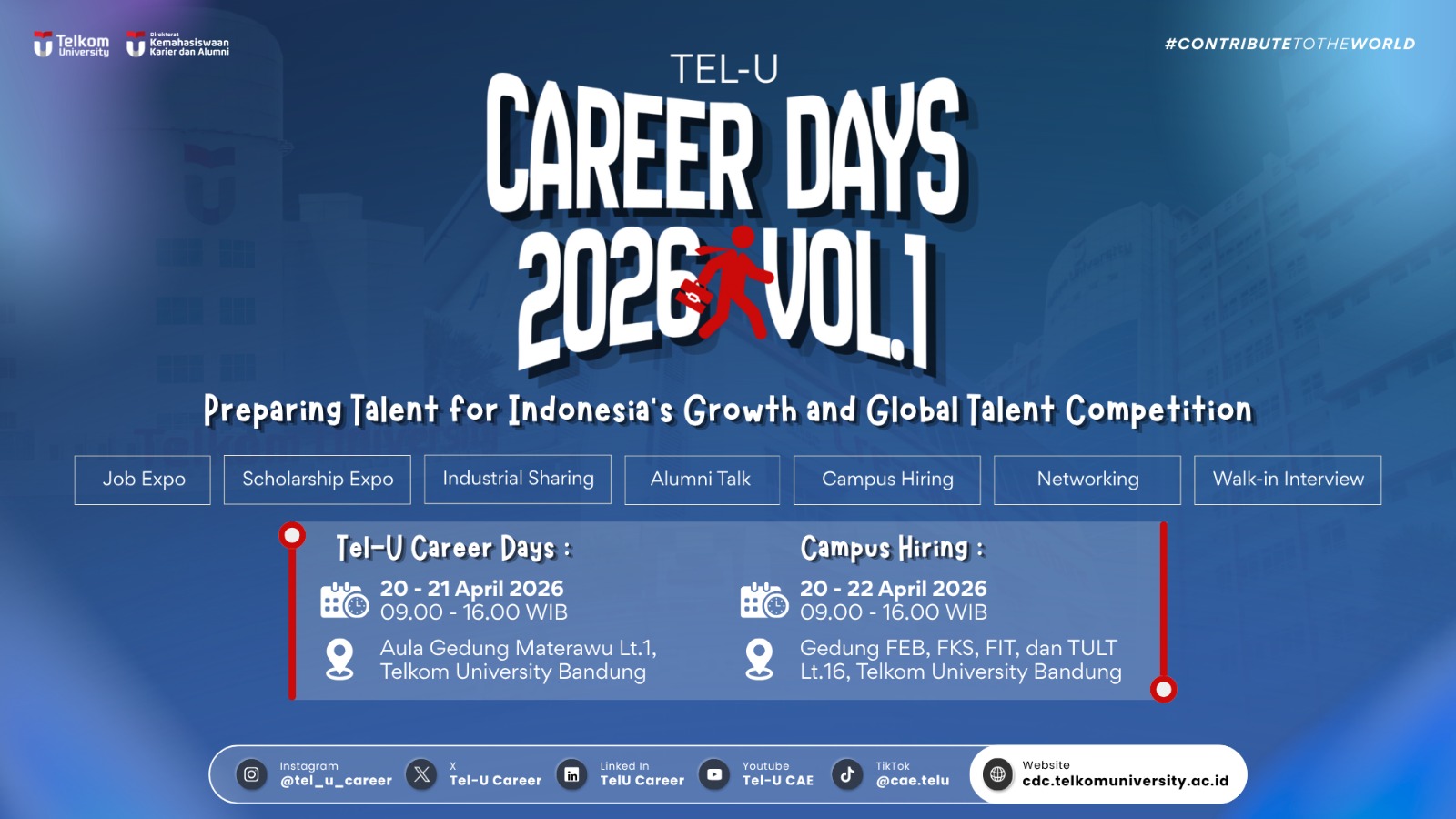 06 Apr 2026Kabar baik bagi mahasiswa dan para pencari kerja! Tel-U Career Days 2026 Vol. 1 akan segera hadir dengan mengusung tema “Preparing Talent for Indonesia’s Growth and Global Talent Competition.” Acara ini dijadwalkan berlangsung pada 20–21 April 2026 di Gedung Materawu, Telkom University.